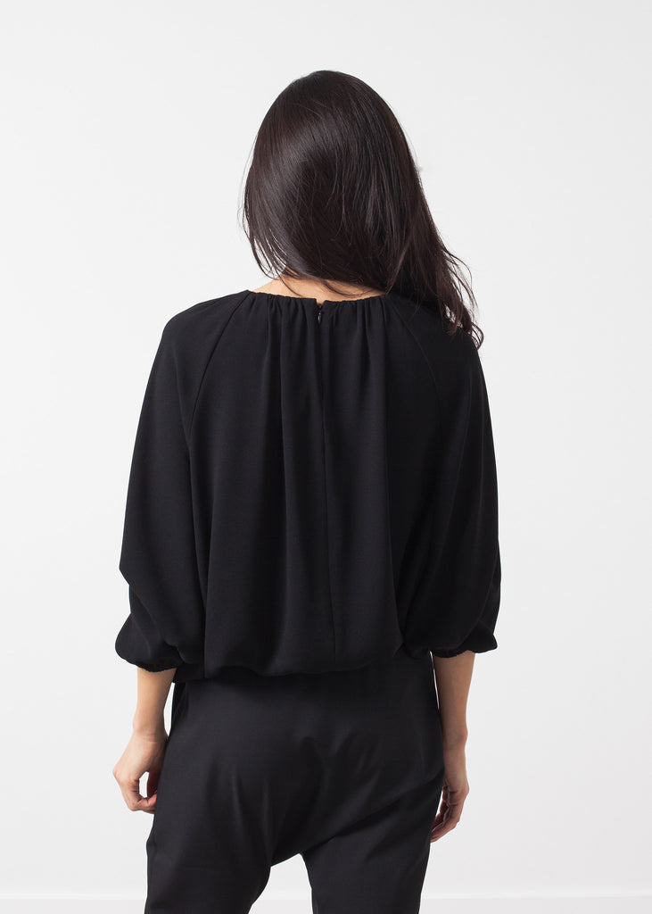 The Bubble Peasant Top from Co. adds some chic fun to your spring selections. Parallel gathers at neck and waist, this piece makes a graceful staple. Dolman sleeves. Hook and eye closure. Invisible back zip closure at center back neck. Color Black. 82% Triacetate, 18% Polyester. Ashley is wearing an X Small.