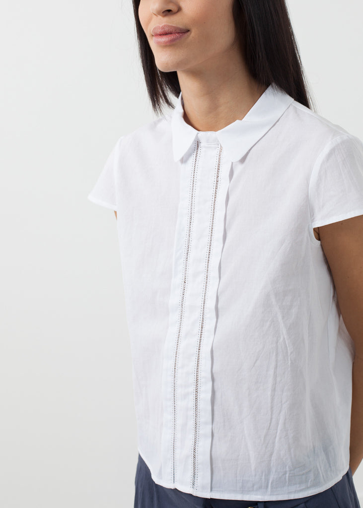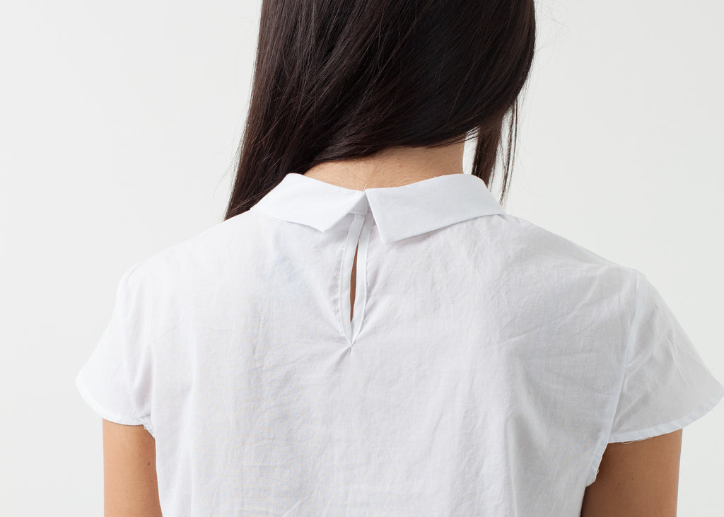 The Rano presents a sweetness to the refined prep. Single button closure at center back neck. Capped sleeves. Lilith. Color White. 100% Cotton. Ashley is wearing an X-Small.